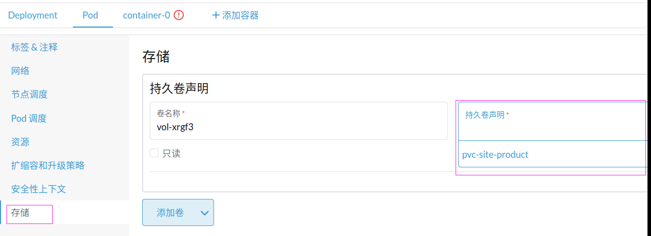 先到Pod中进行配置卷名称
