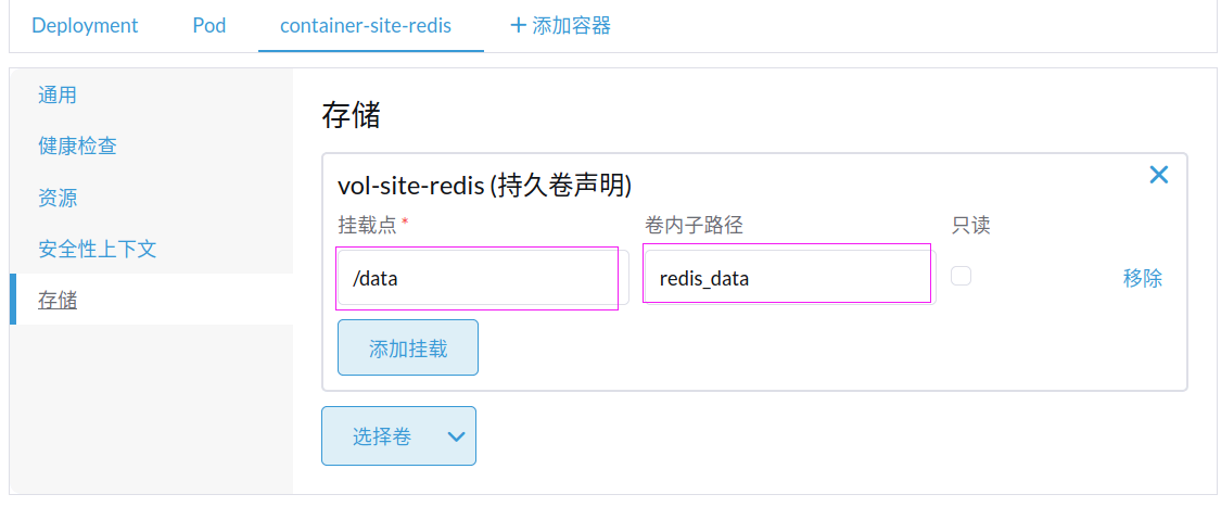然后再到容器的存储也选择卷(挂载点是值容器中的路径)